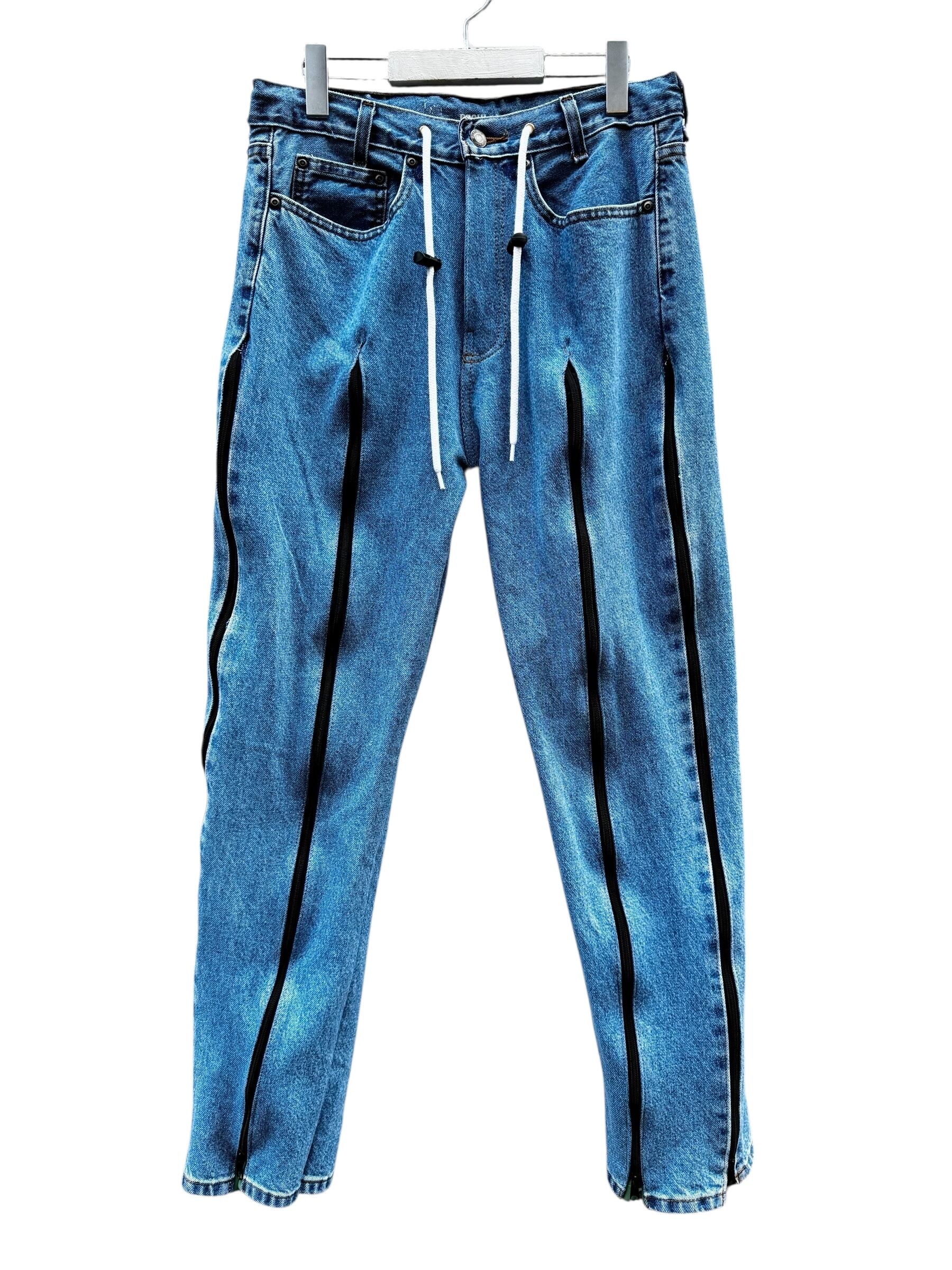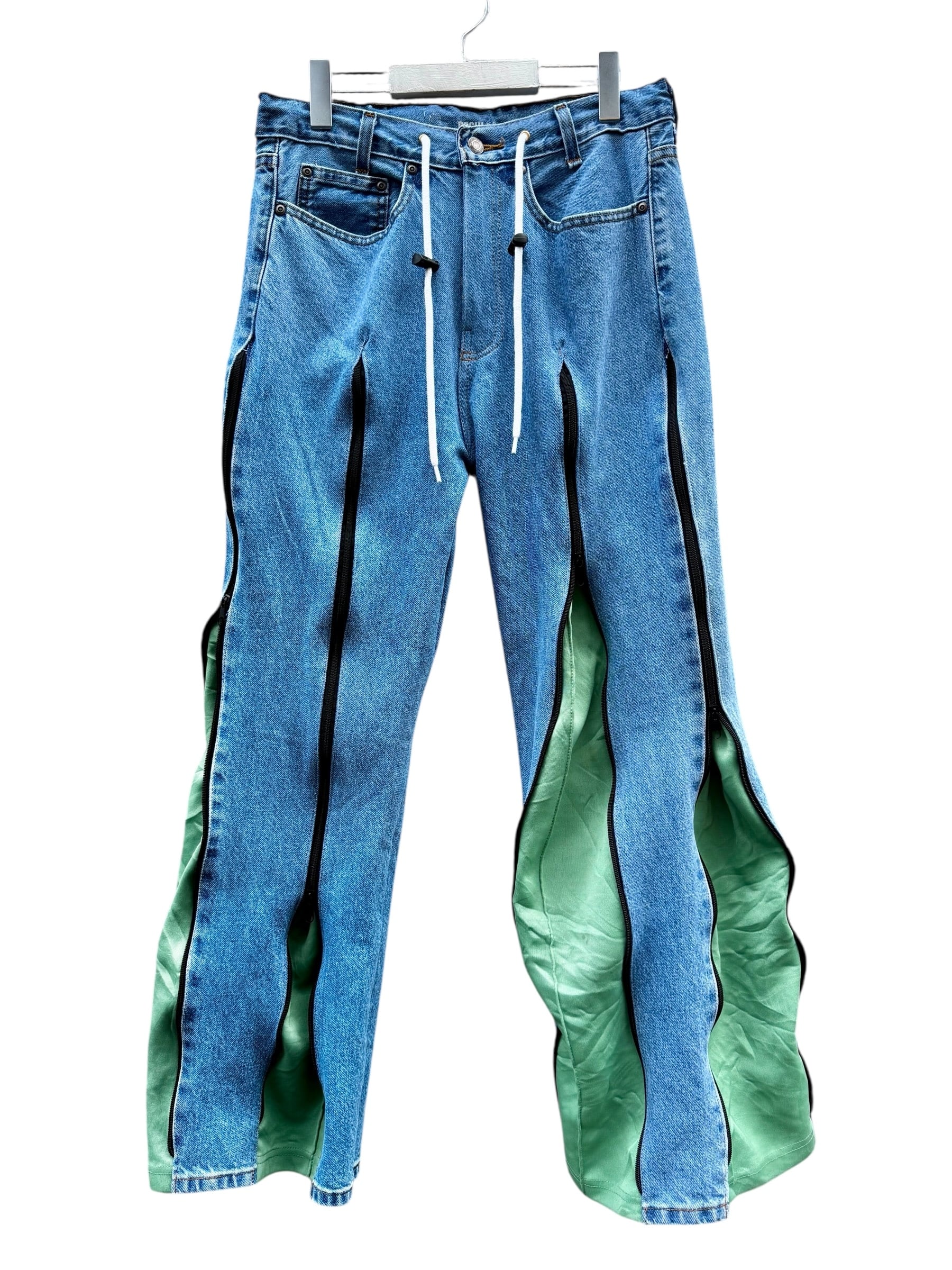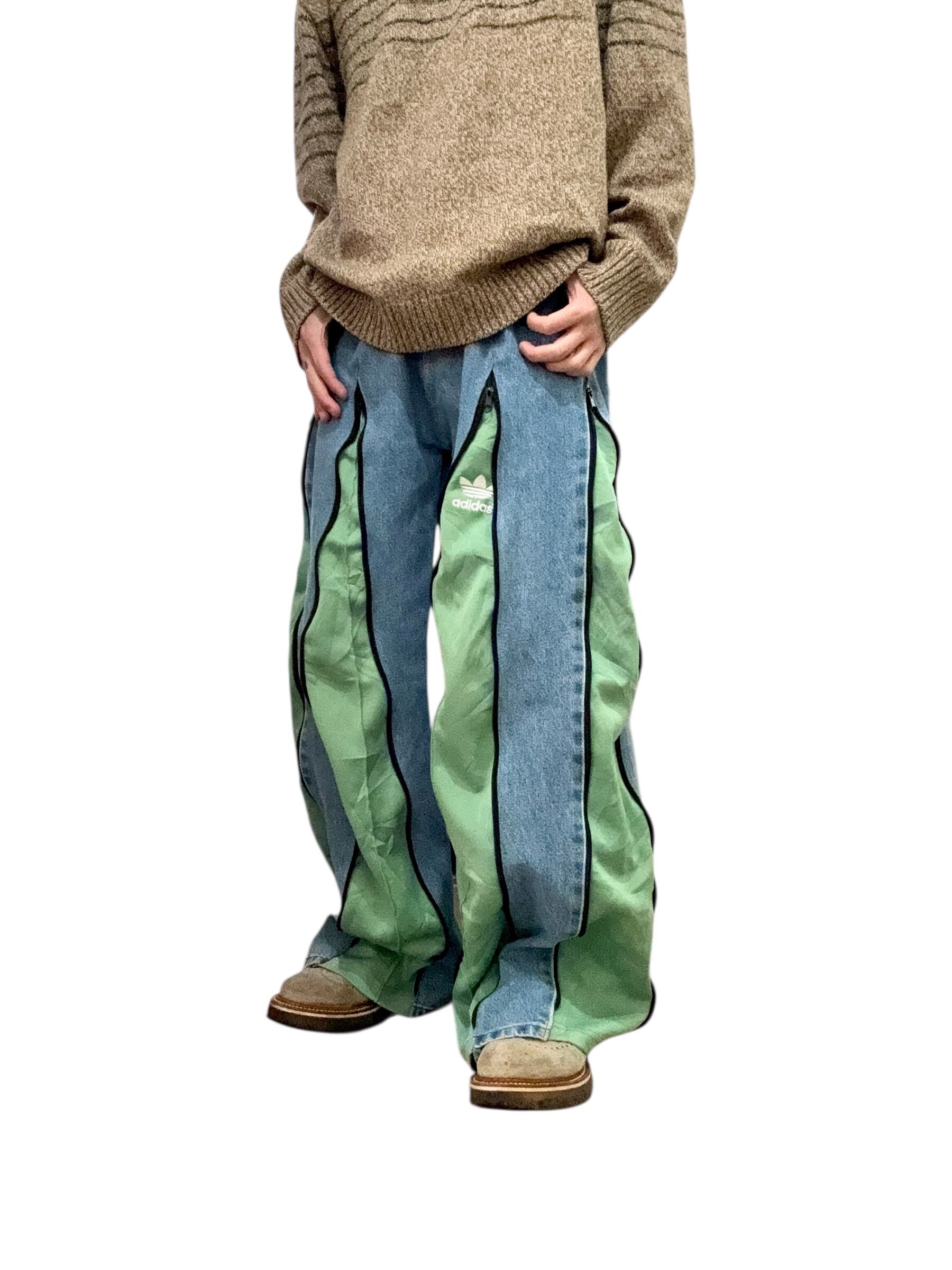 remake denim × jersey zipper gimmik desing pants blue × green / リメイク デニム ジャージ ジッパーギミックデザインパンツ【USED/古着】