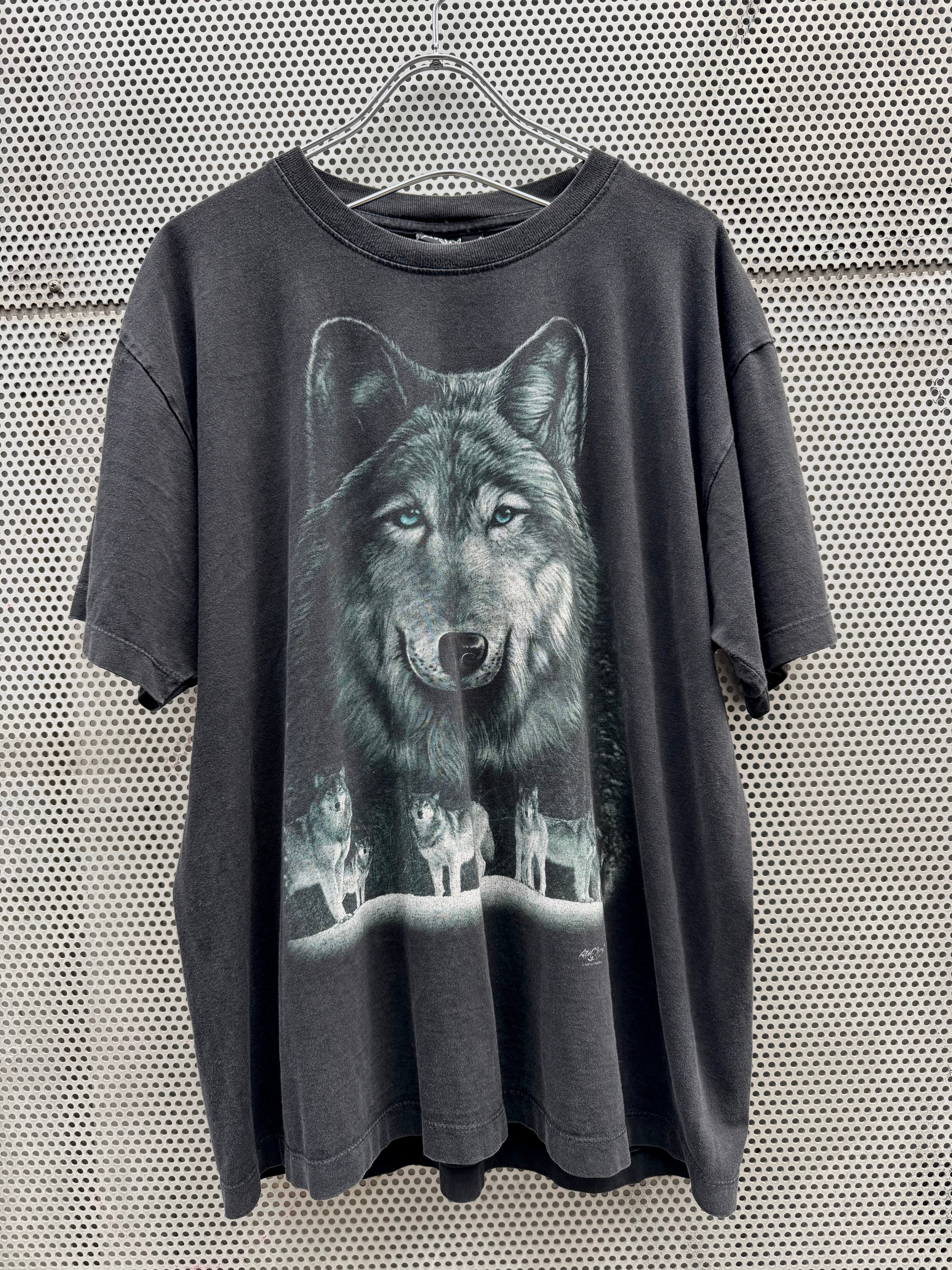 vintage wolf printed fade-black tee / ヴィンテージ ウルフ両面プリント フェードブラックTシャツ【USED/古着】
