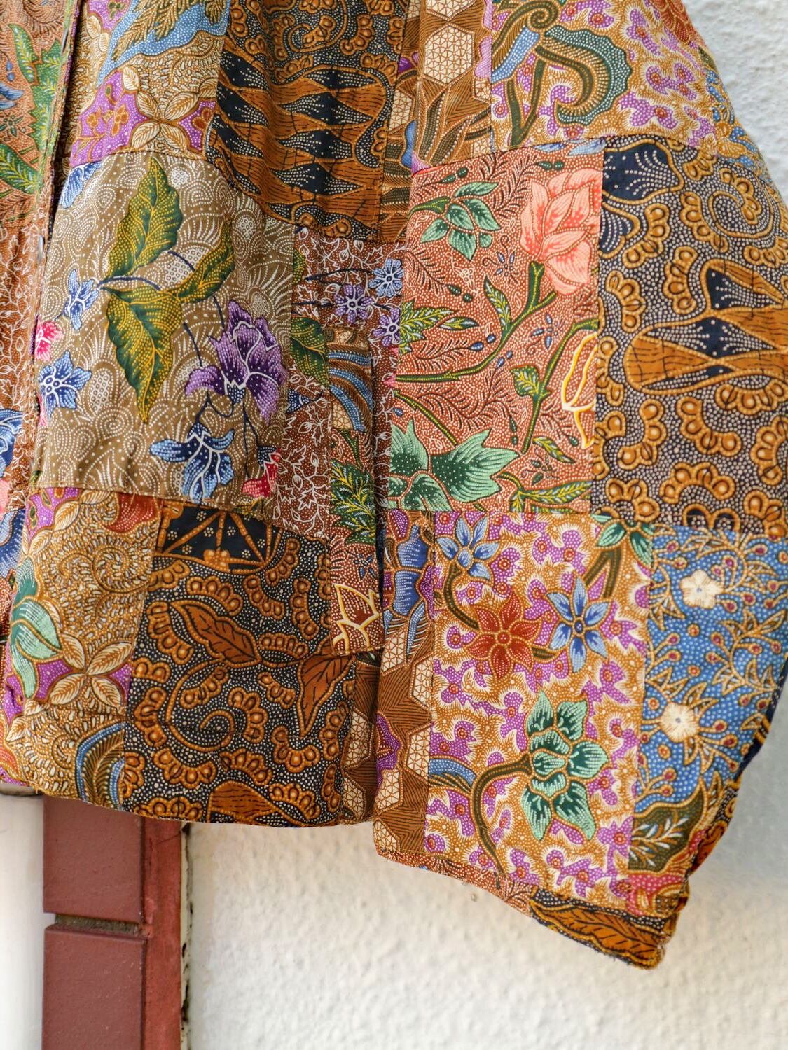 様々なボタニカル柄生地をパッチワーク状に切り替えられた、お洒落感と絶妙なウサンくささがイイ塩梅にマッチした一品。