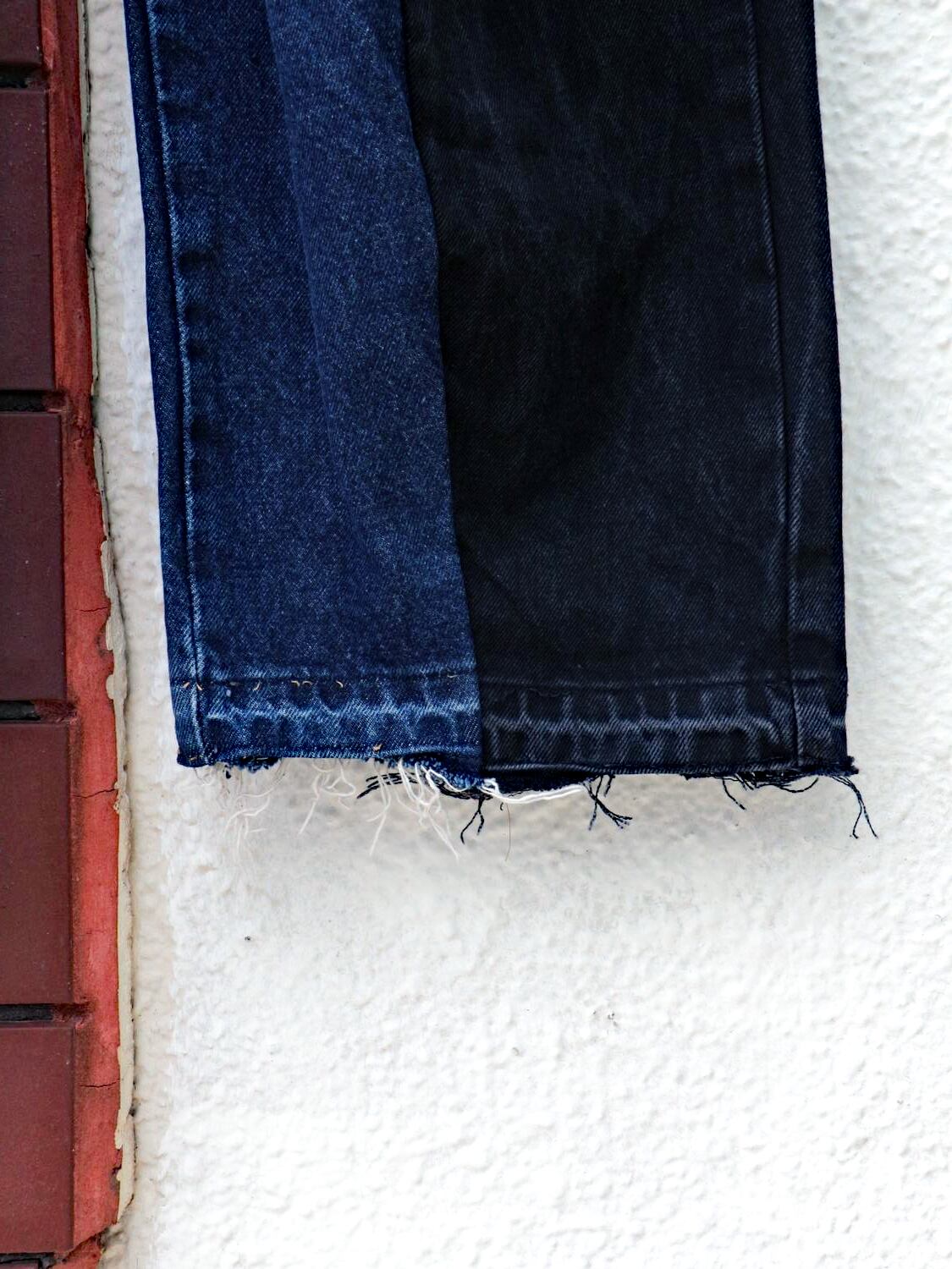 Wranglerのパンツをメインに使用した、2本のデニムパンツを解体して再構築されたバギーパンツ。