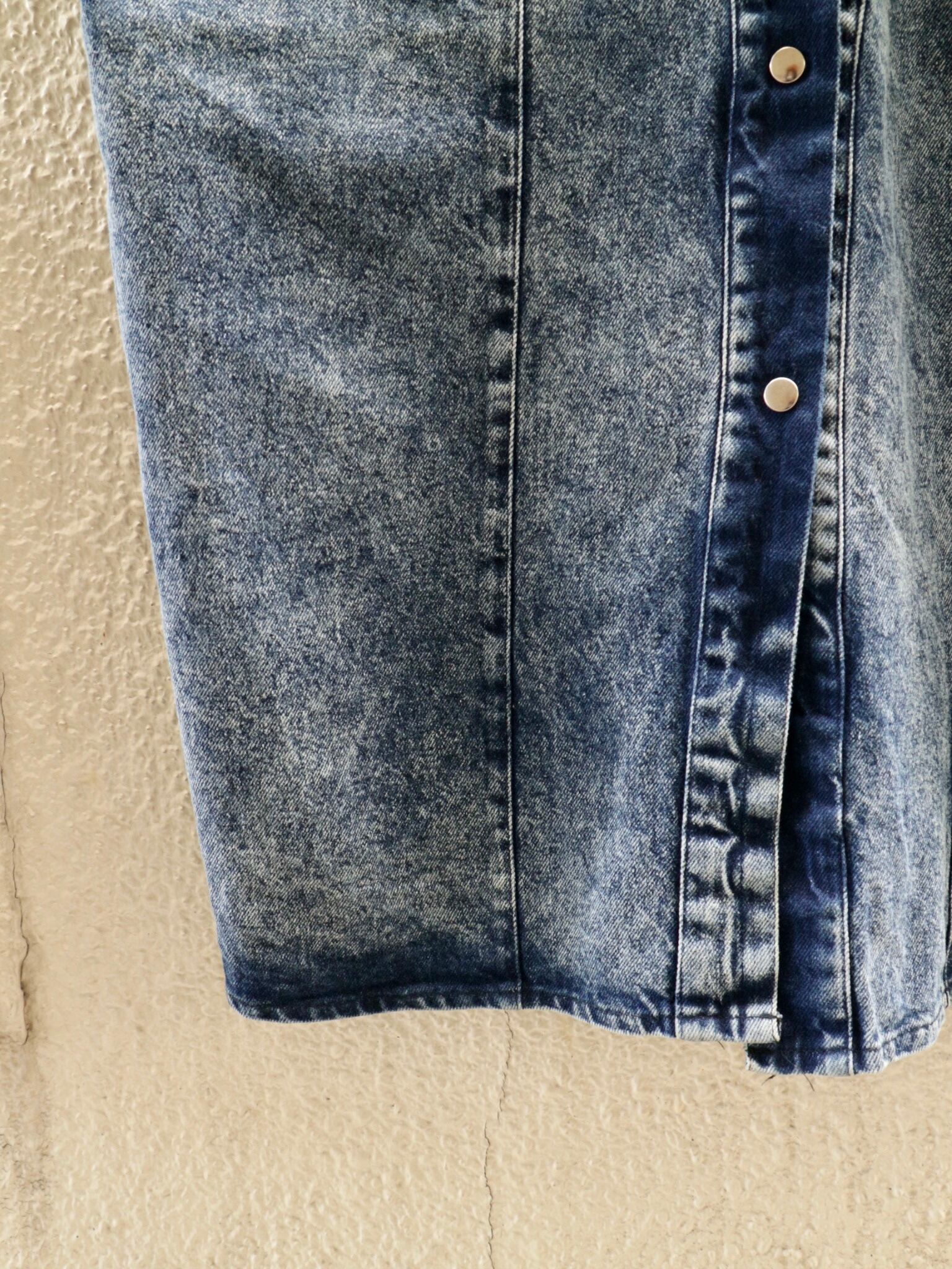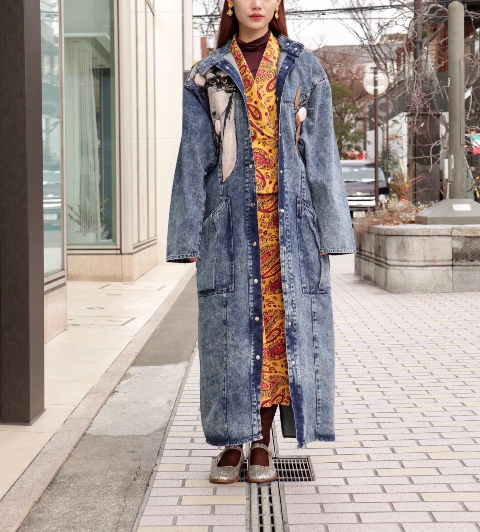 着丈130cmのスーパーロングなケミカルデニムコートと