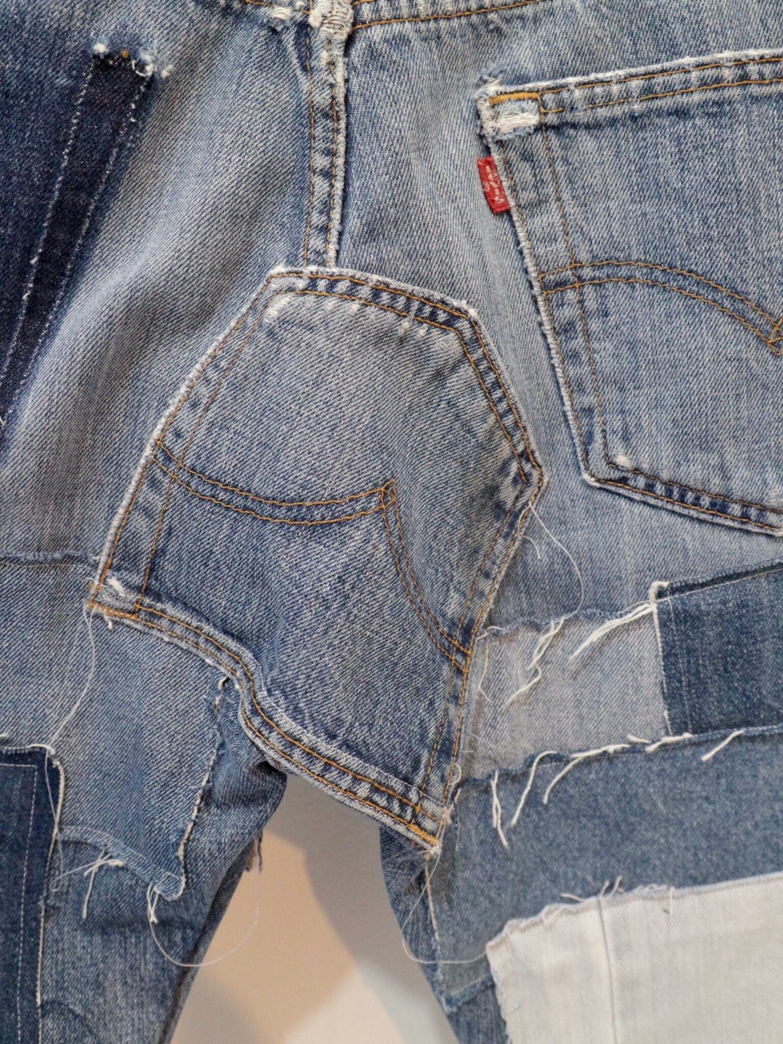 USEDのLevi's 501をベースに、様々な生地の端切れを幾重にも縫い重ね、
