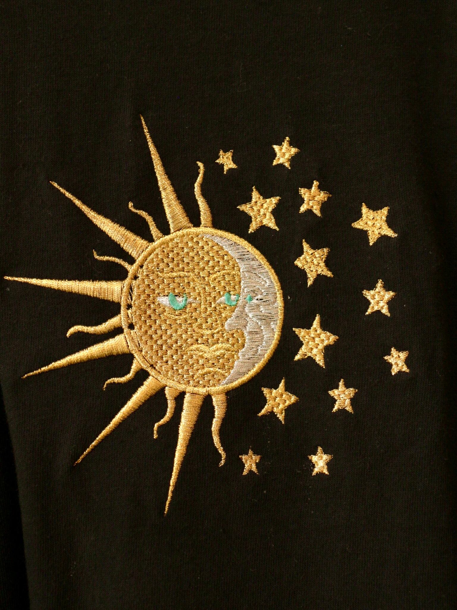 太陽と月の刺繍が施された、遊び心のあるデザイン。