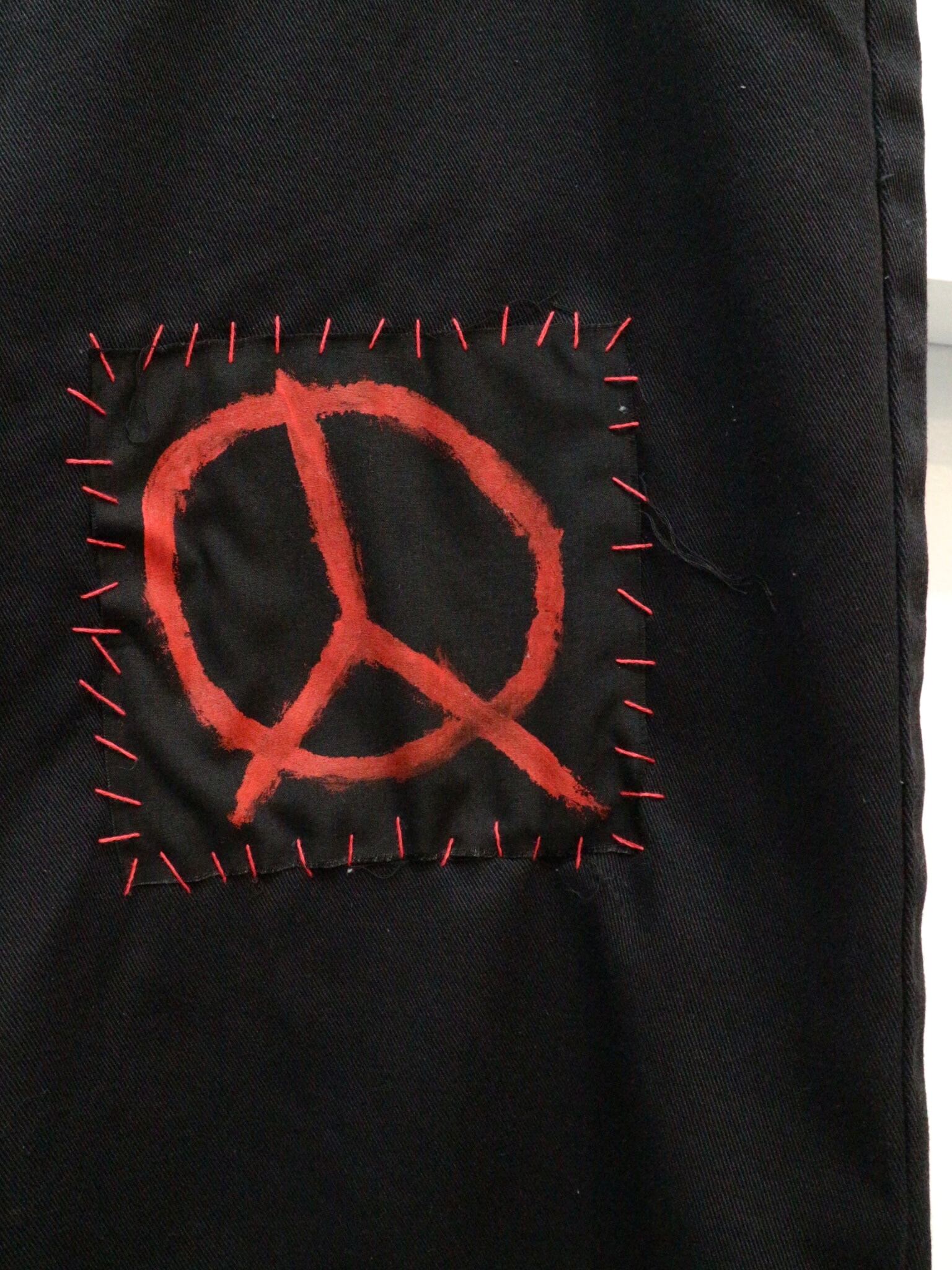 "罪" "罰" "ピースマーク"をハンドペイントしたパッチを配した、DIY精神溢れる一品。