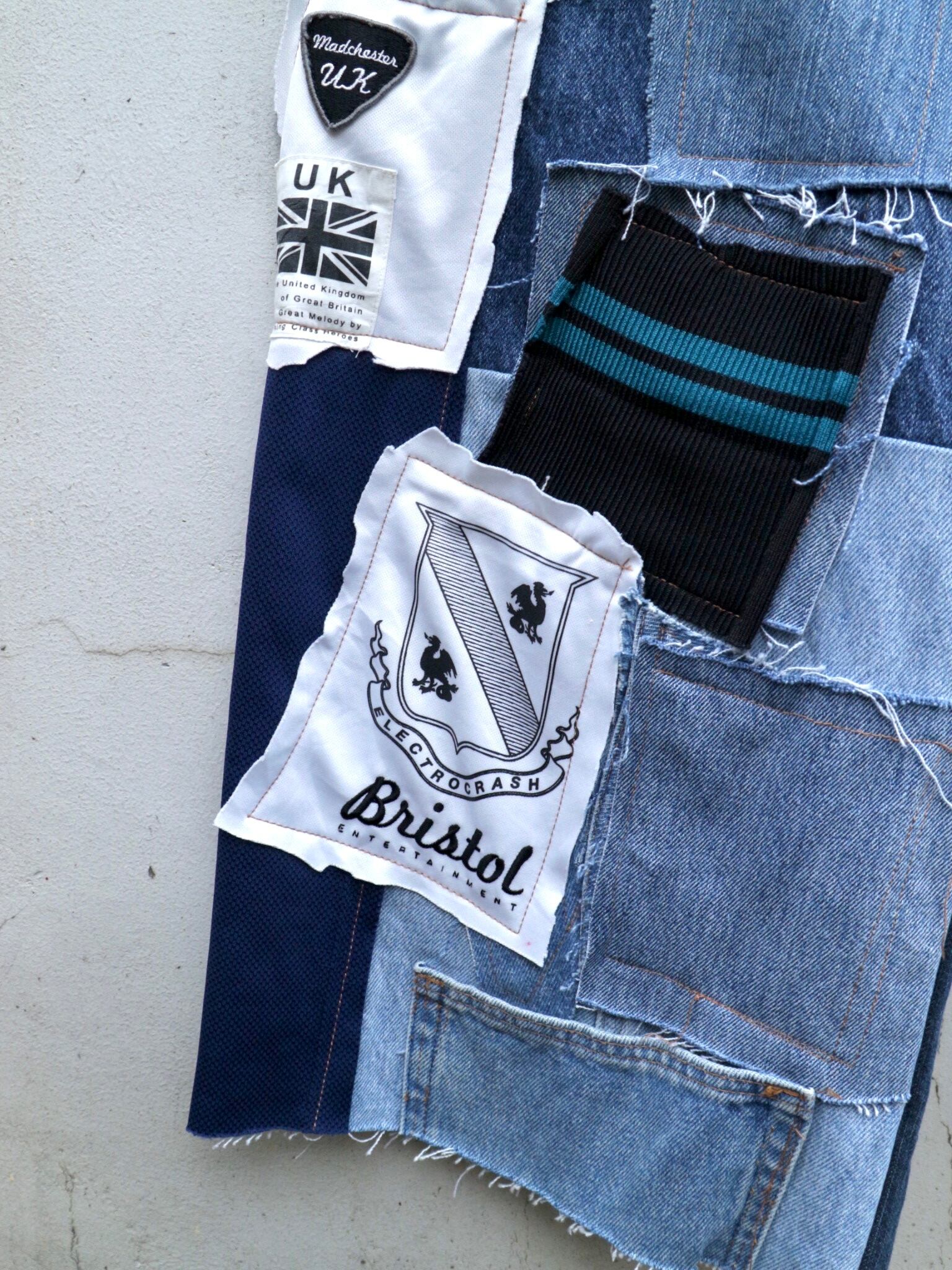 様々なデニムやジャージ生地の端切れ等を幾重にも縫い重ね、